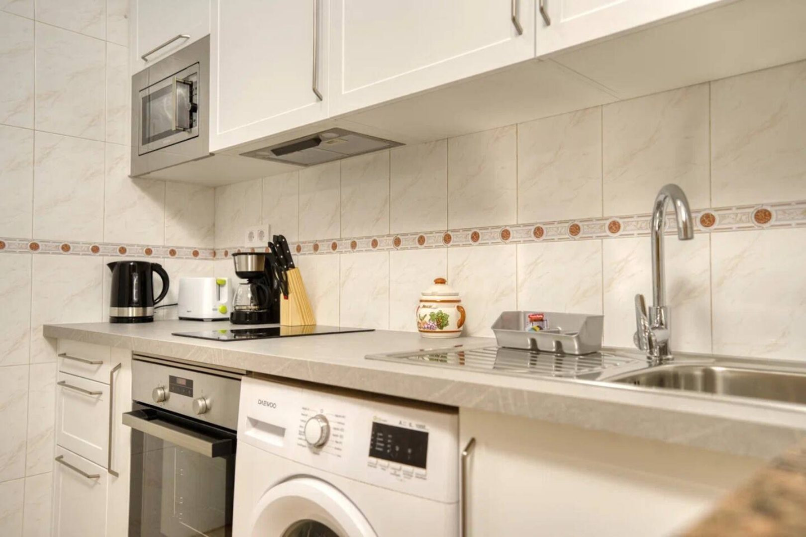 Sie verfügen über eine voll ausgestattete Küche (Kaffeemaschine, Toaster, Mikrowelle, Wasserkocher, Küchenutensilien usw.), eine Waschmaschine, ein Bügeleisen und einen Fernseher, WLAN.