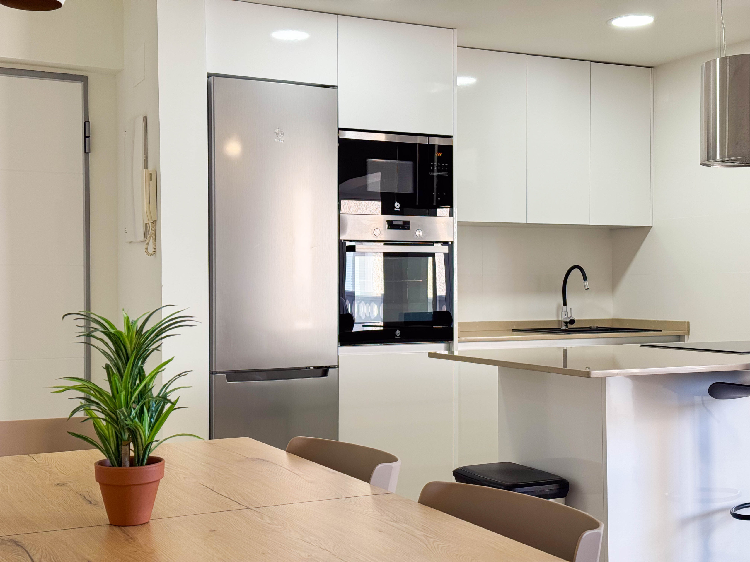 Cocina separada, refrigerador, cocina eléctrica, 3 placas, horno, microondas, lavadora.