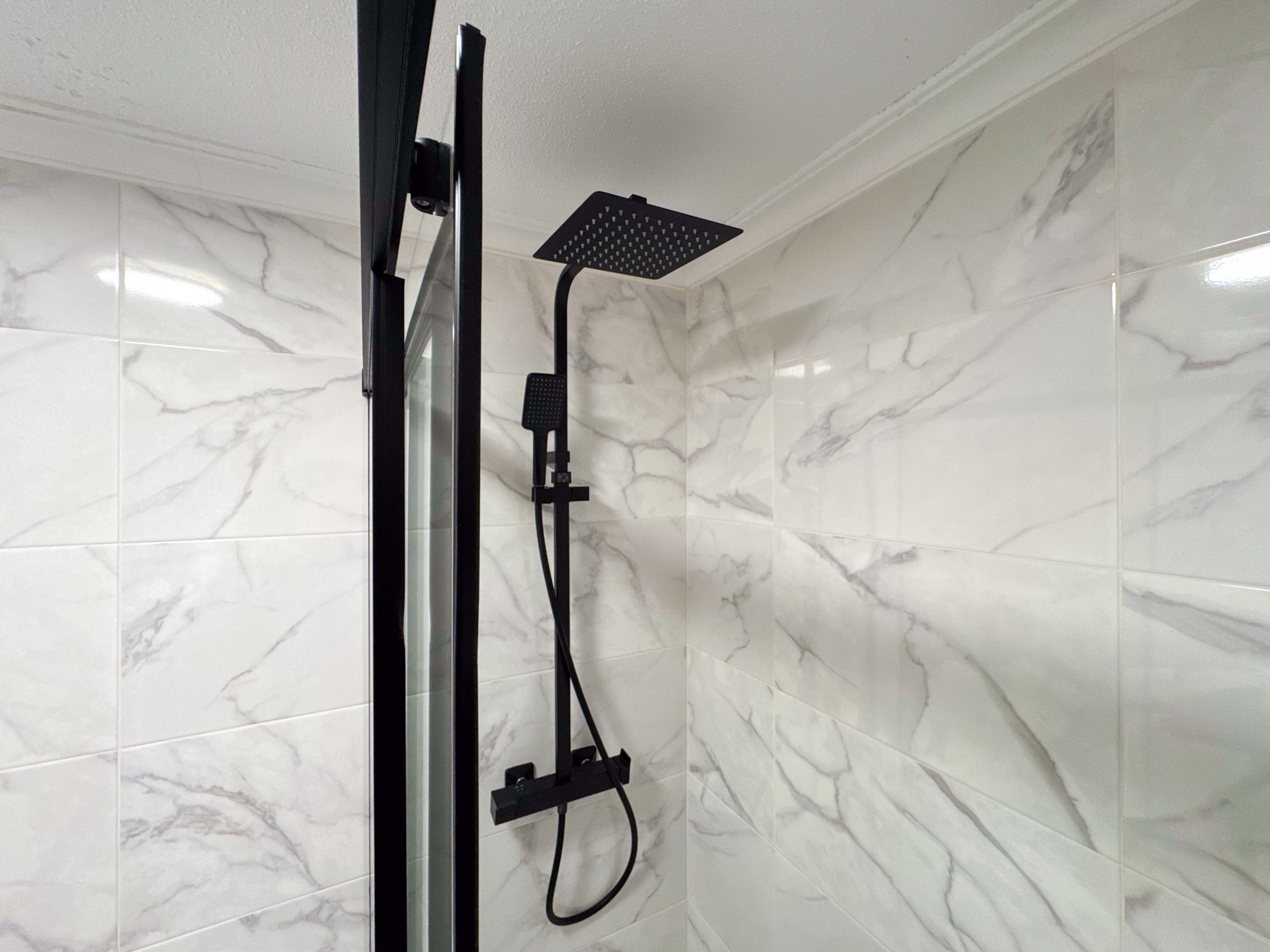 El apartamento tiene una reparación nueva, así como muebles nuevos, electrodomésticos y plomería.