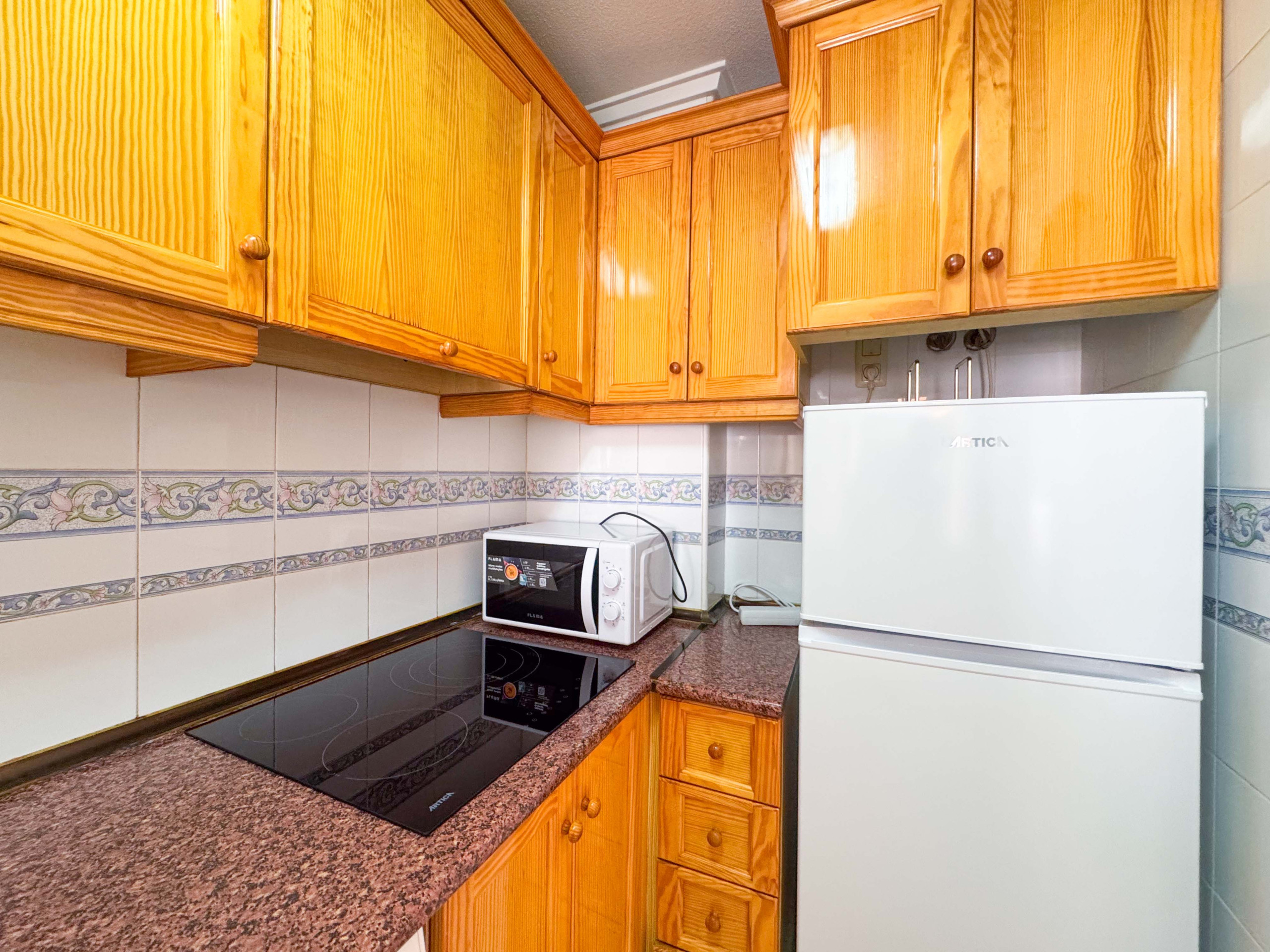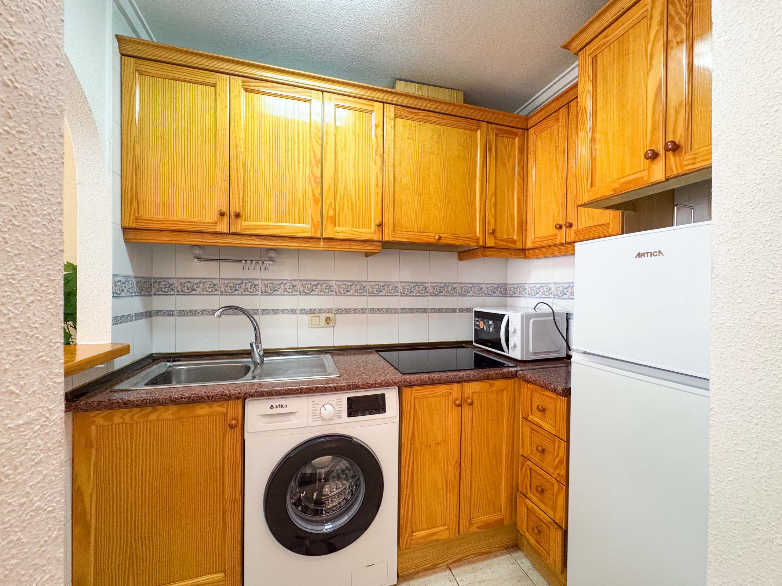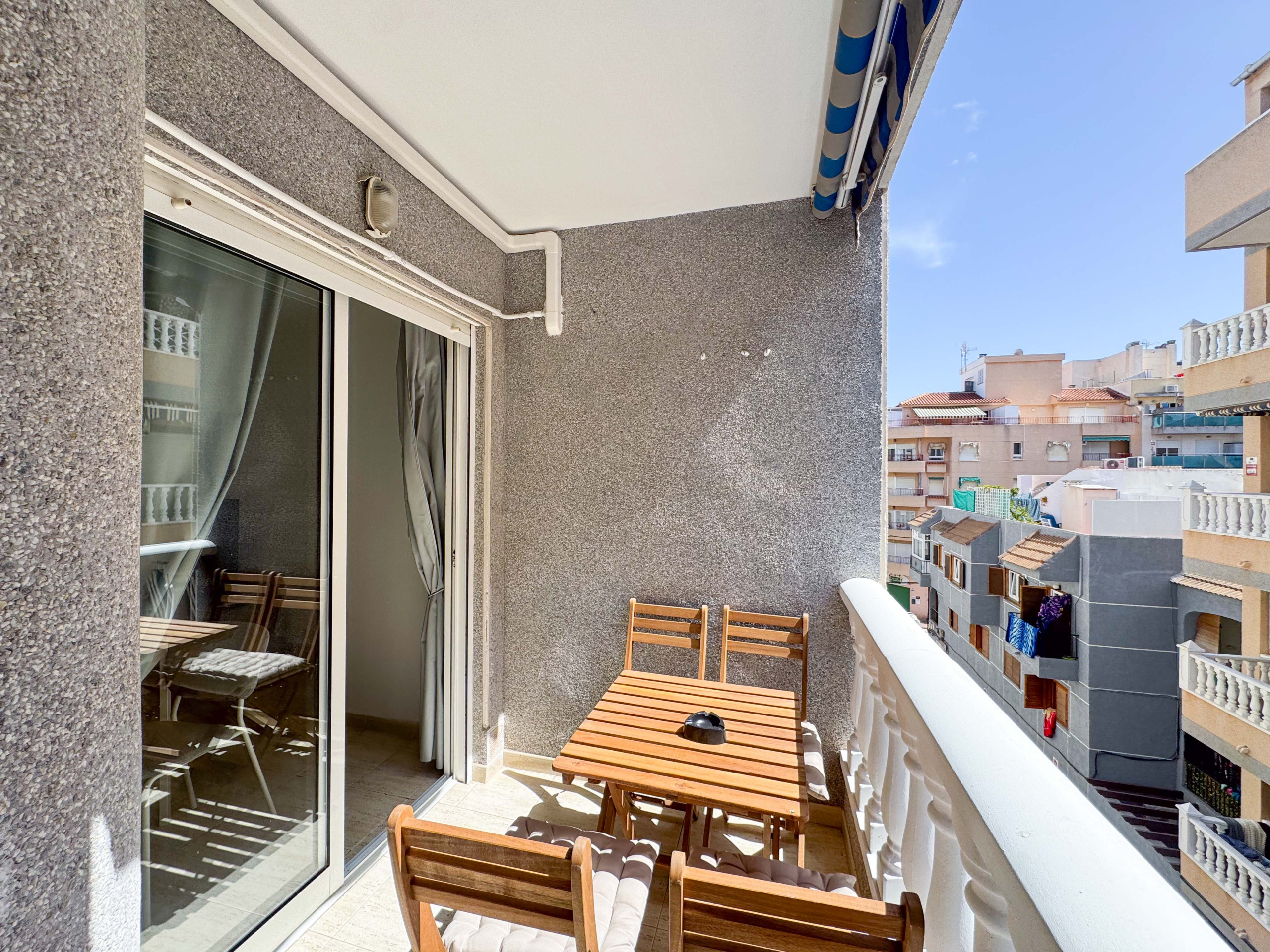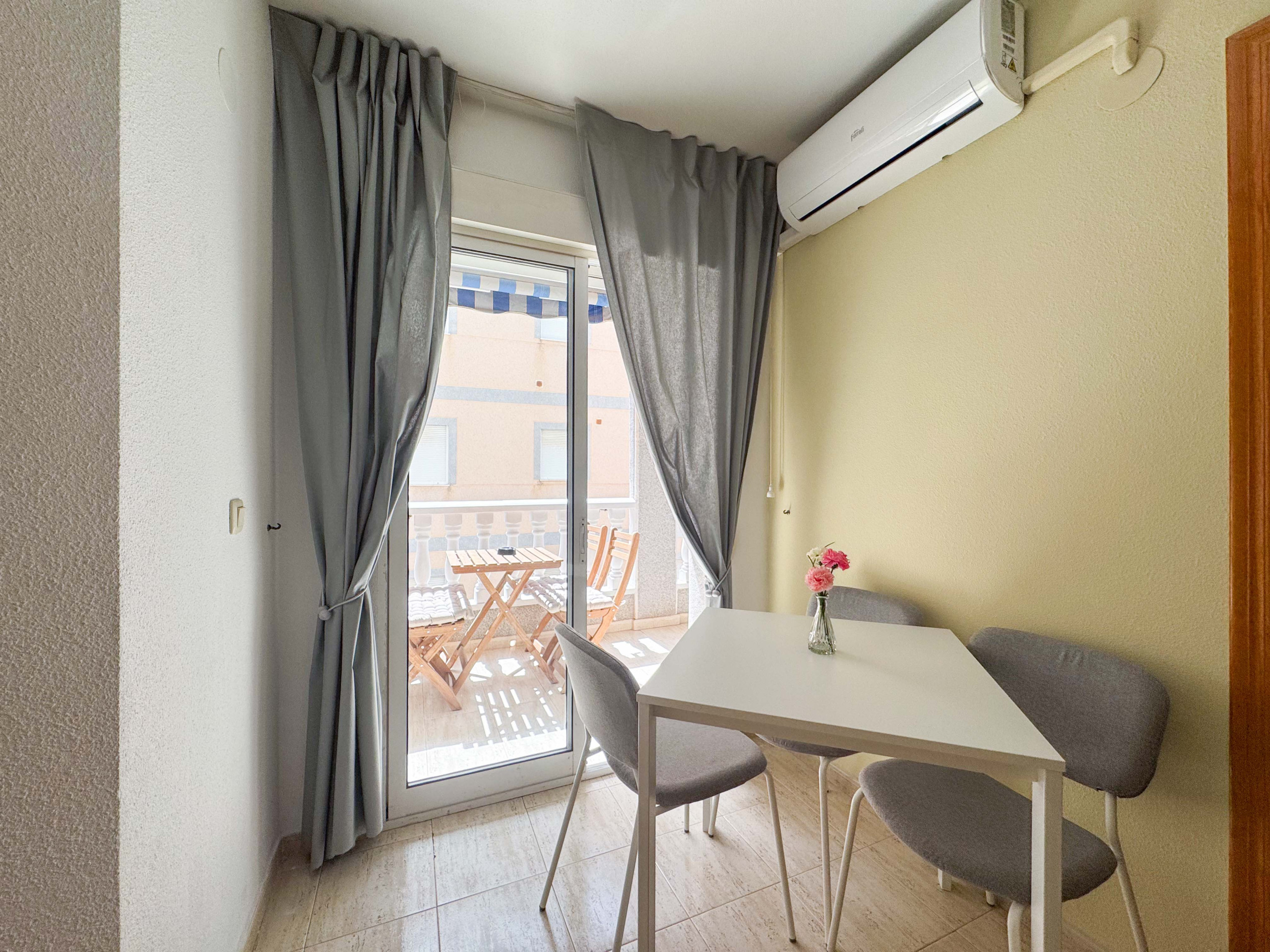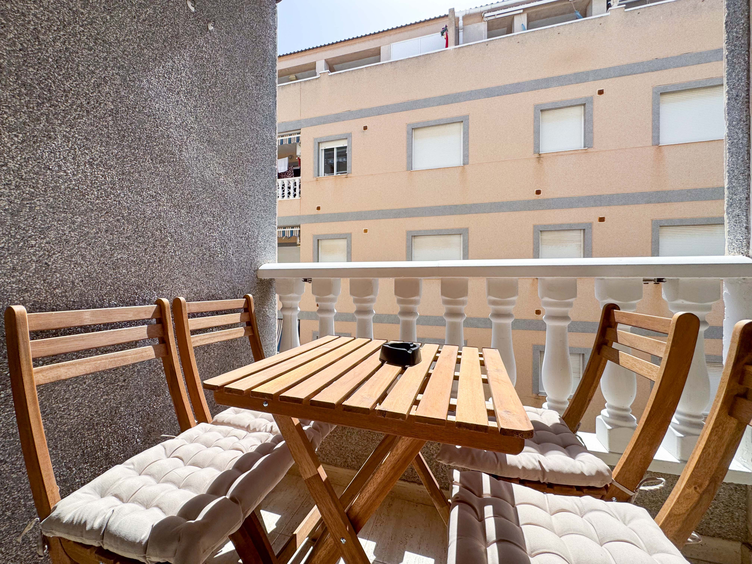 El apartamento precioso en Torrevieja consiste de un salón con cocina americana, 1 dormitorio, 1 baño con plato de ducha, un balcon. Capacidad es para 4 personas (1 cama matrimonio y 1 sofa cama).