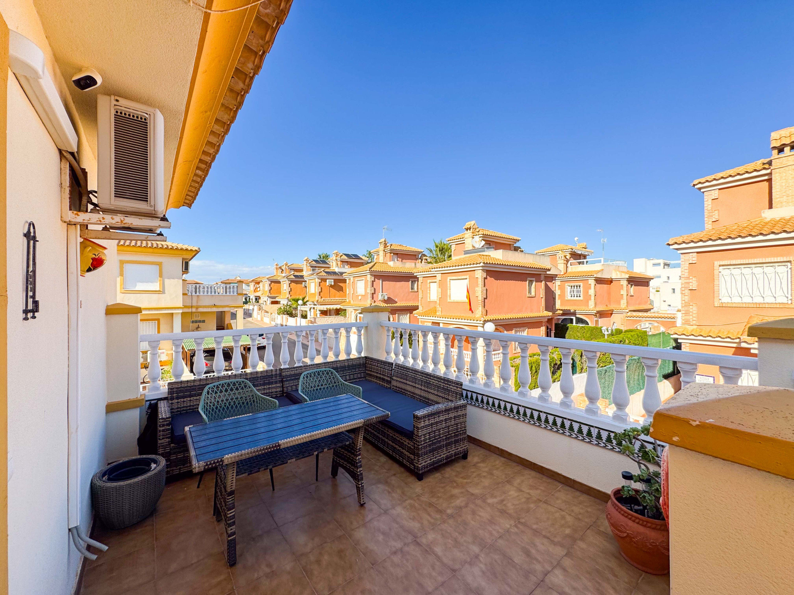 En la terraza hay una mesa con sofa y sillas, en el patio hay una barbacoa donde se puede cocinar, comer y difrutar del aire libre. También hay unas tumbonas donde se puede tomar el sol con privacidad.