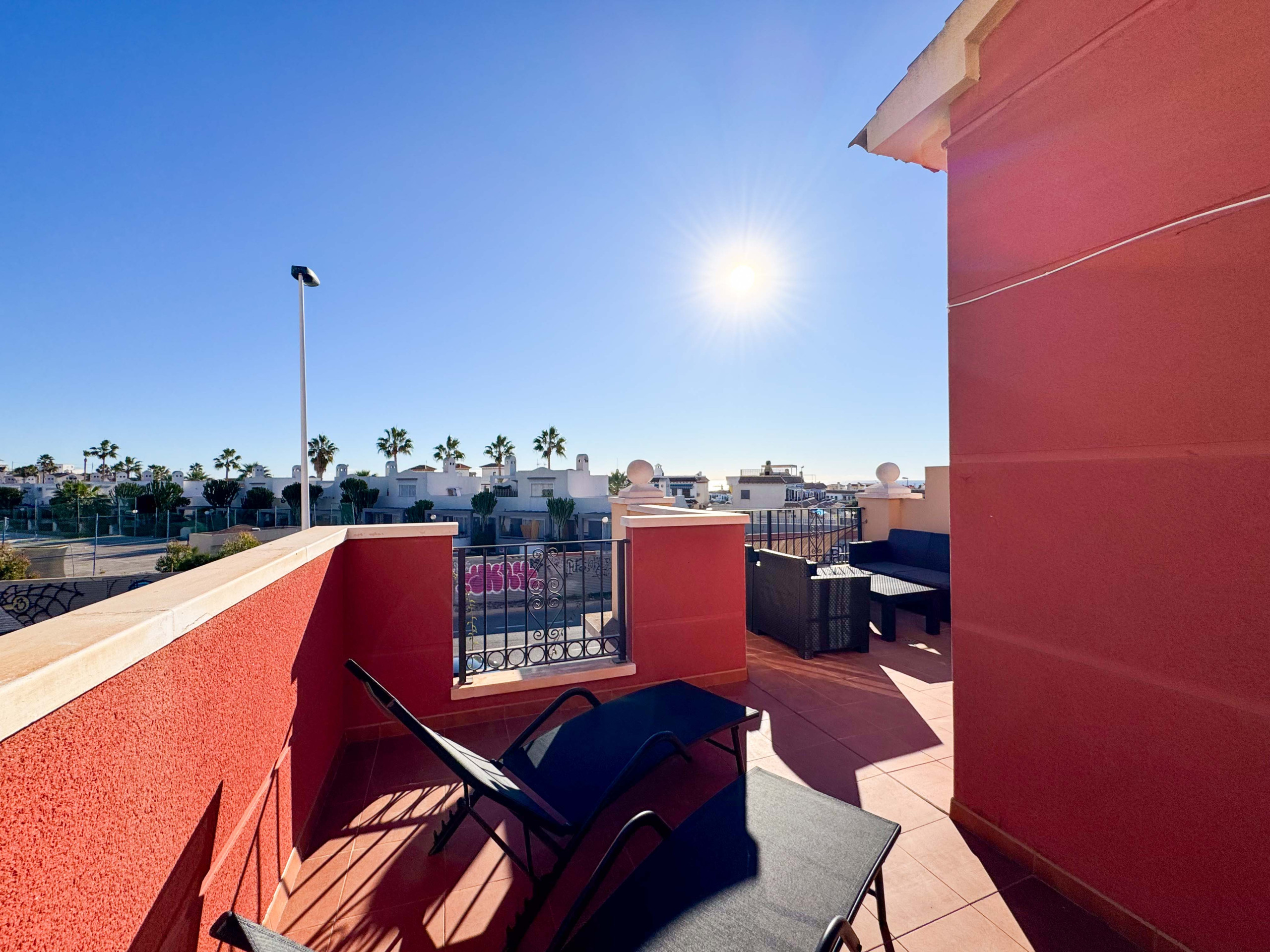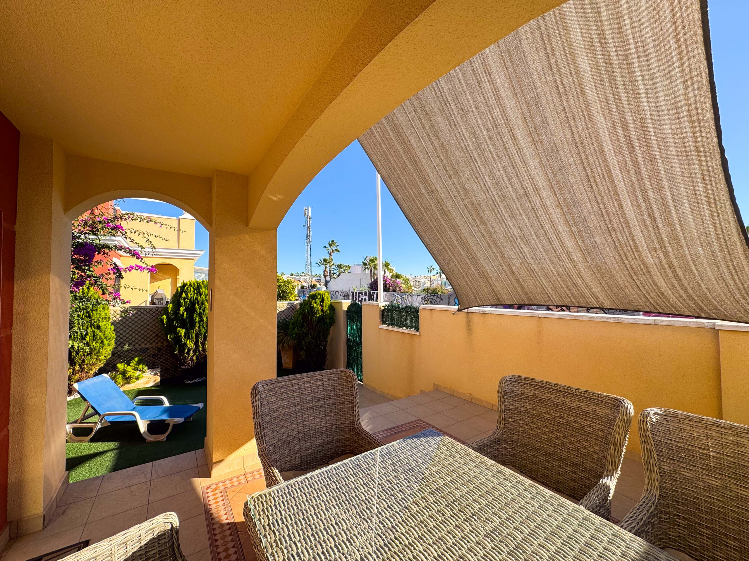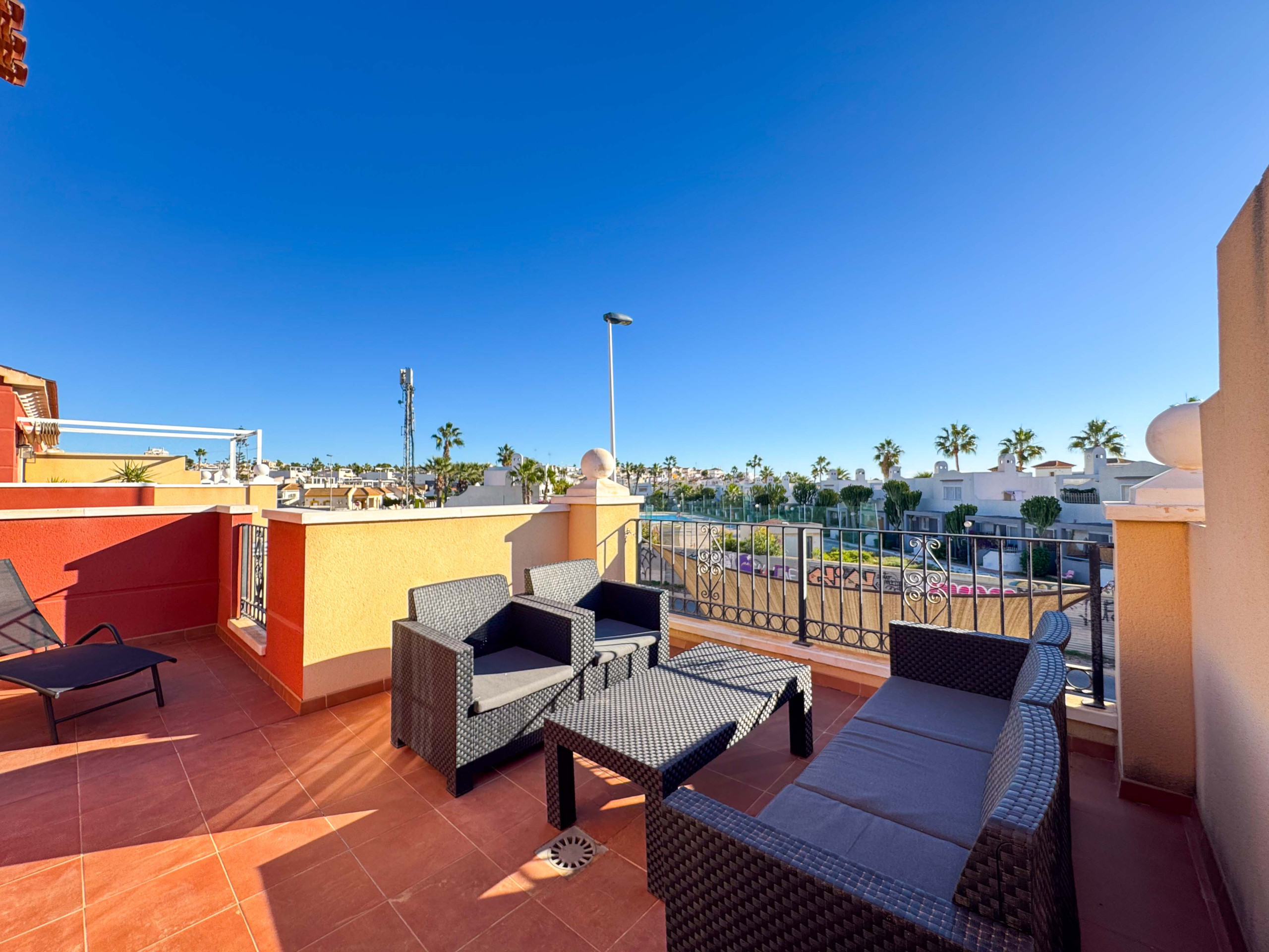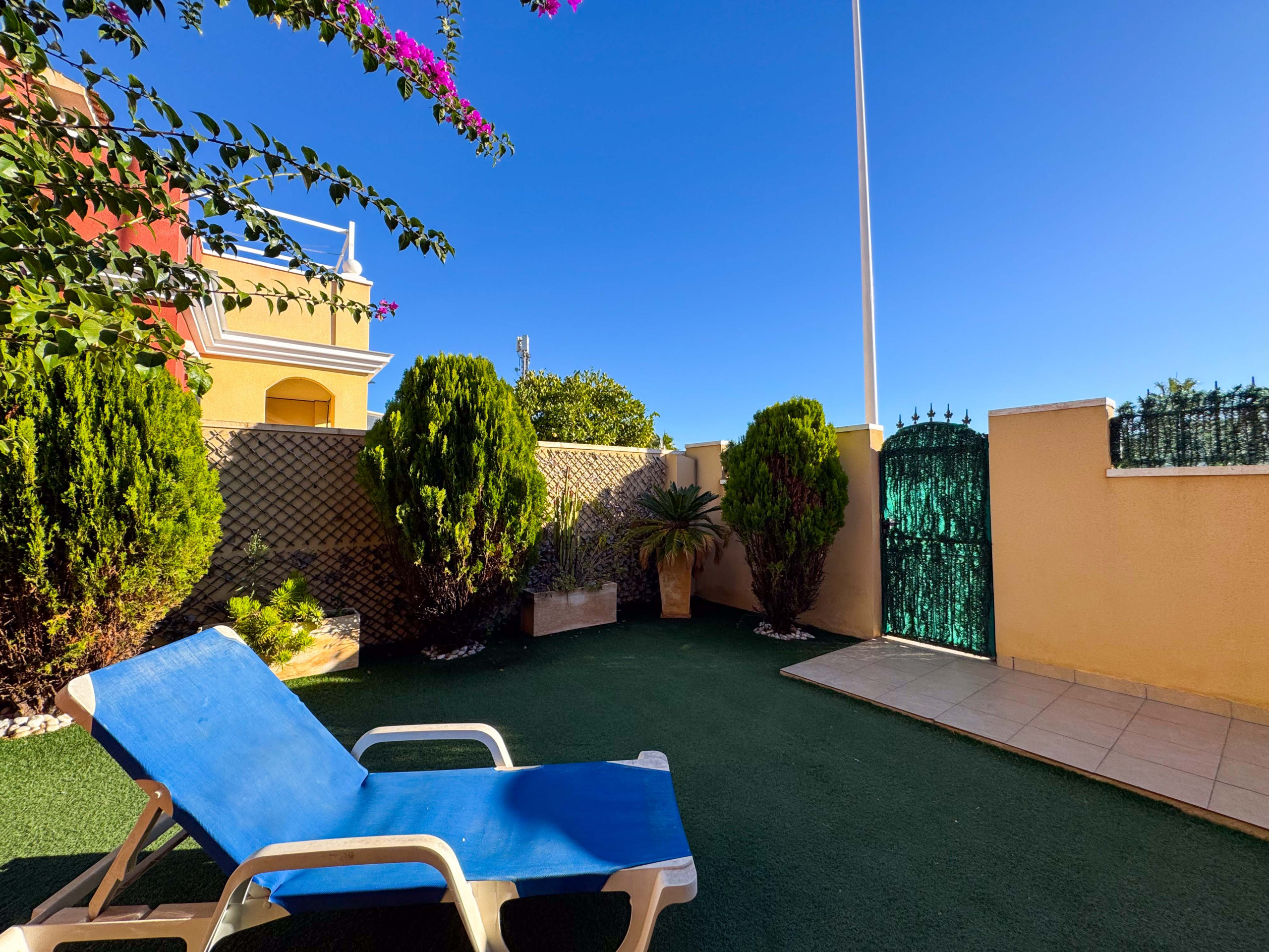La casa esta ubicada dentro de una urbanización en Torrevieja, solo a unos 900 metros de la Playa de los Locos. Sin embargo, para los que prefieren bañarse en la piscina, hay una piscina comunitaria dentro de la urbanización.