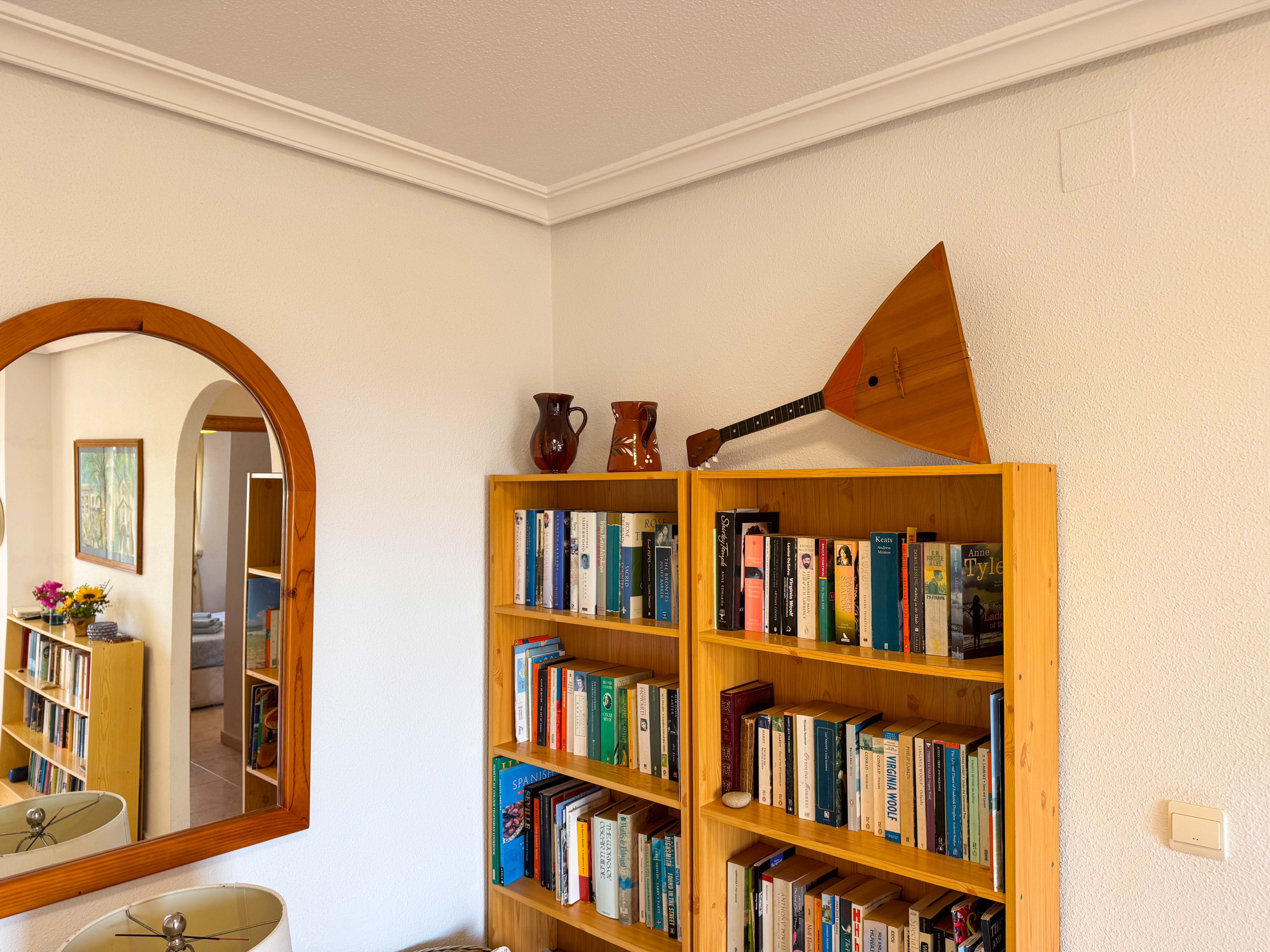 The living room is fully furnished for a comfortable stay: armchairs, sofa, tables, shelves with books.