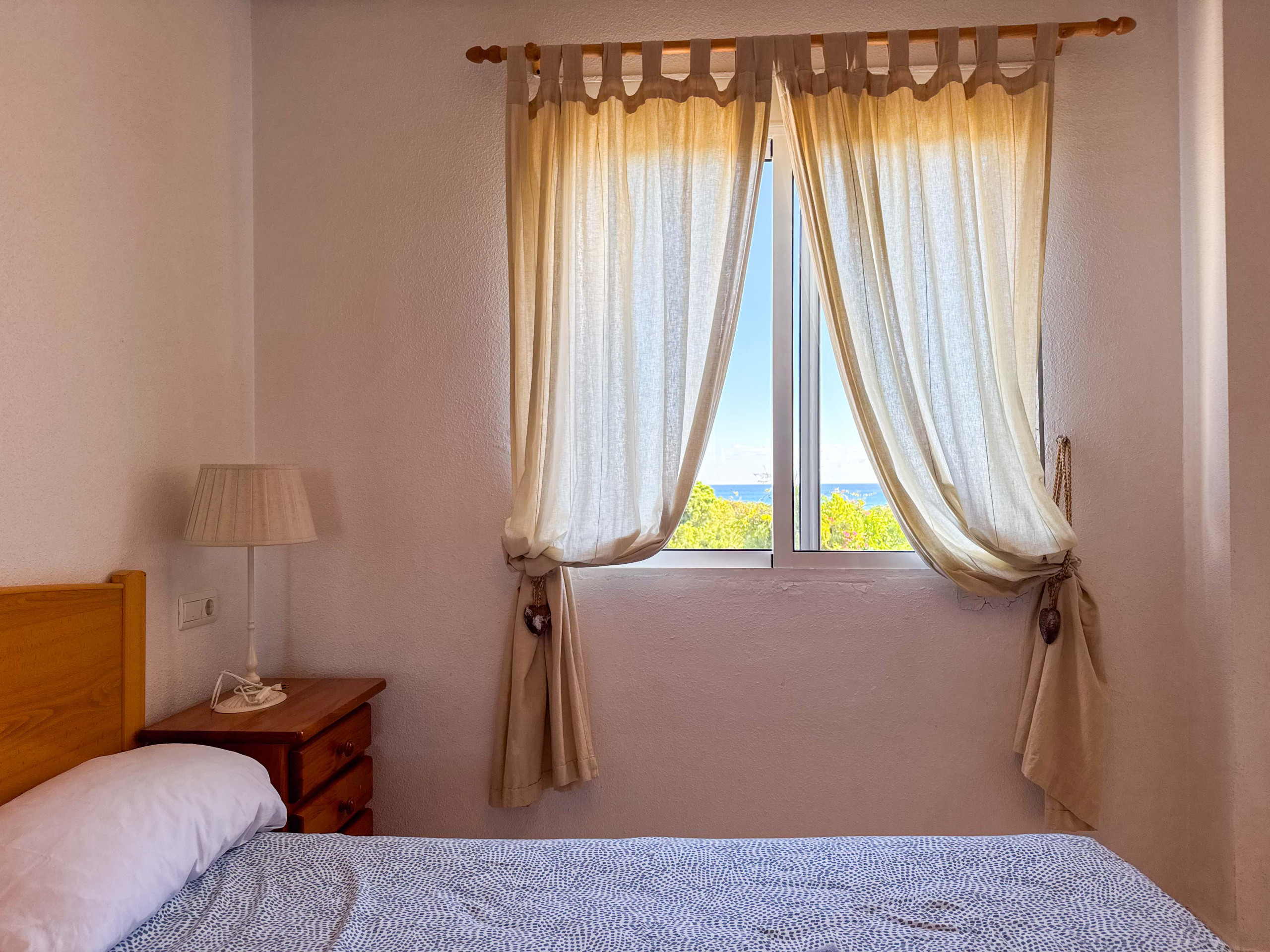 In the second bedroom there is a large bed, dresser and wardrobe; the view from this bedroom opens to the sea.